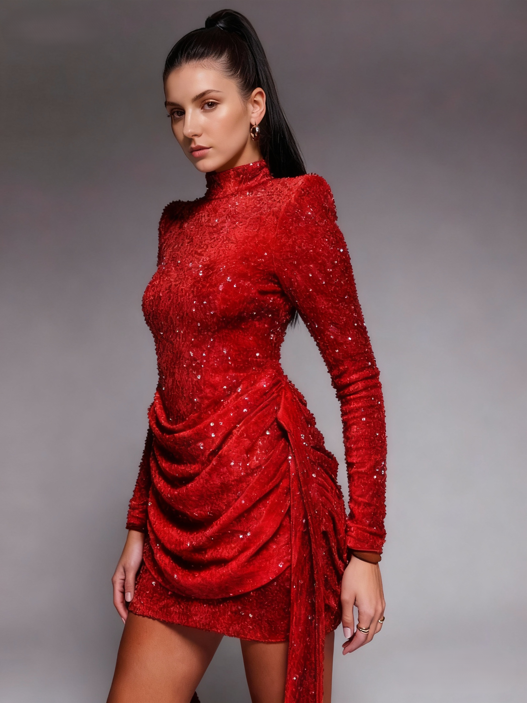 • Mermaid Christmas Party Dresses Sequins Cocktail Short/Mini High Neck Long Sleeves Homecoming Ruched