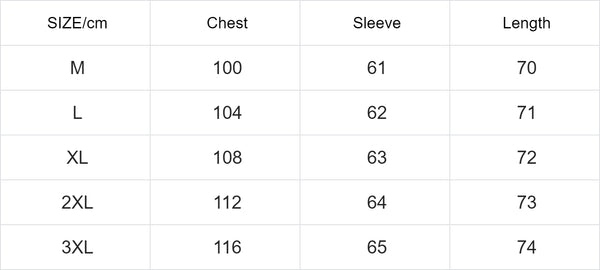 | SIZE/cm | Chest | Sleeve | Length |