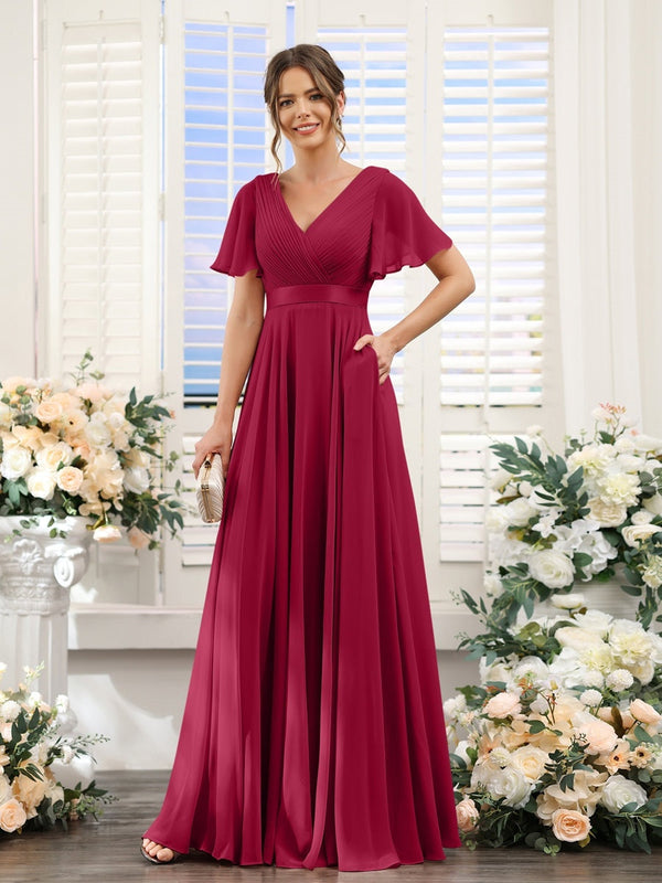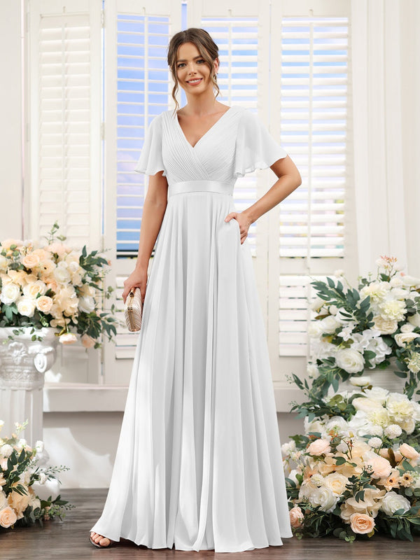 #N5411865 A-Line/Princess V-Neck Short Sleeves Chiffon Bridesmaid Dresses with Pockets