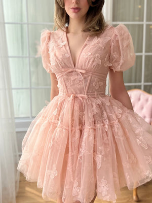 A-Line/Princess V-Neck Short Sleeves Mini Formal Prom Dresses with Flower