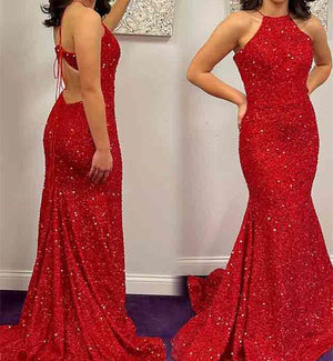 Mermaid/Trumpet Halter Sleeveless Long Prom Dresses With Sequins