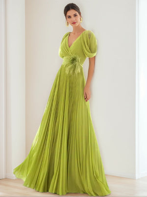 A-Line/Princess Chiffon Evening Dresses with Feather V-Neck Short Sleeves Formal Pleated Dress