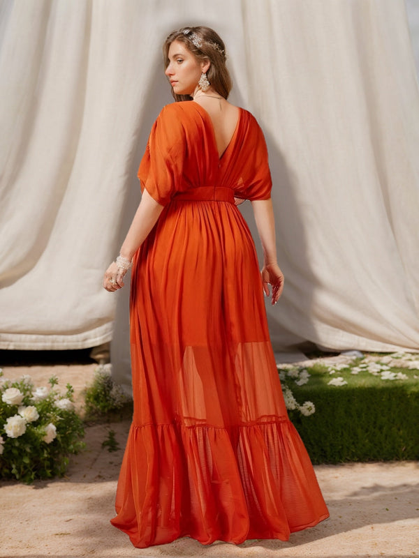 #N5412115 A Line/Princess Deep V-Neck Half Sleeves Floor-Length Plus Size Bridesmaid Dresses with Ruffles