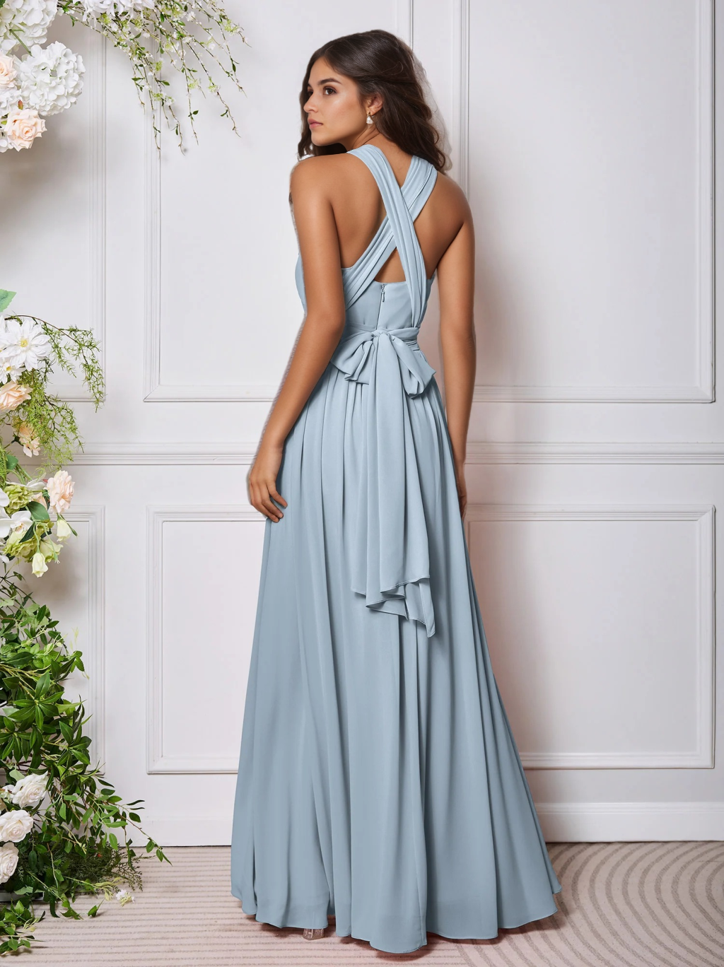 • A-Line/Princess Halter Sleeveless Floor-Length Chiffon Bridesmaid Dress