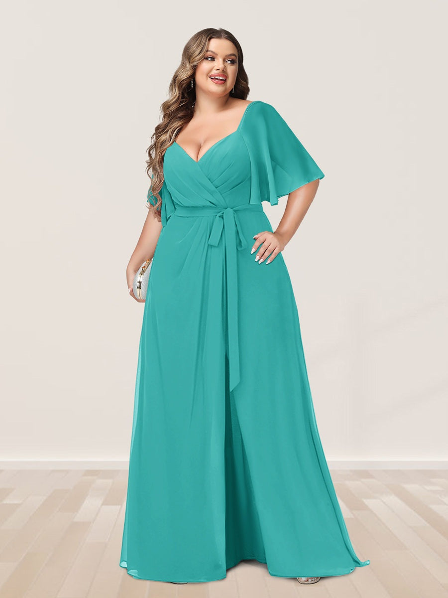#N5411947 A-Line/Princess V-Neck Half Sleeves Plus Size Bridesmaid Dresses with Split Side