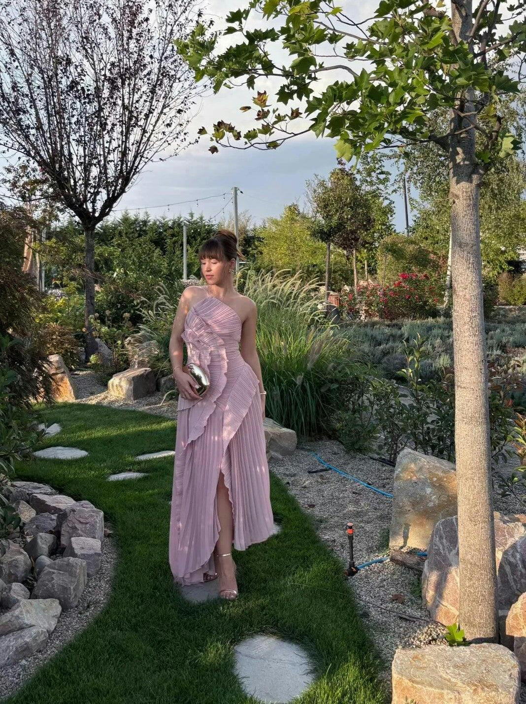 #N359901 Sheath/Column Wedding Guest Dress Halter Neck Sleeveless Ankle Length Ruffles Dress with Front Split