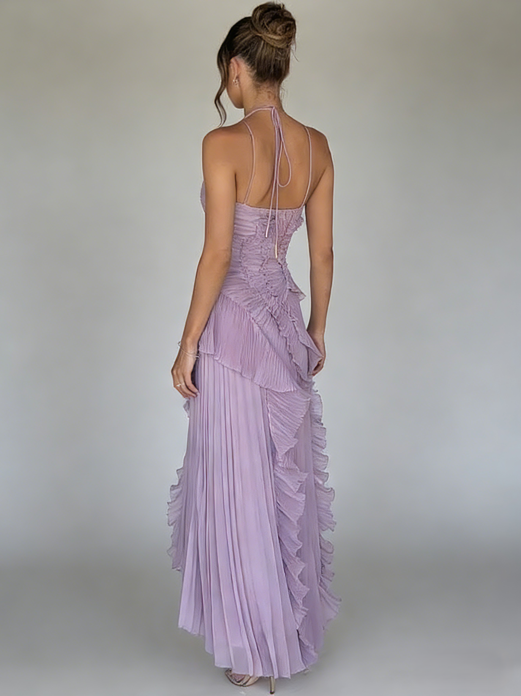 • Sheath/Column Wedding Guest Dress Halter Neck Sleeveless Ankle Length Ruffles Dress with Front Split
