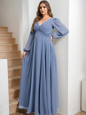 A-Line Floor Length Long Sleeve V Neck Wedding Guest Dresses Chiffon with Pleat