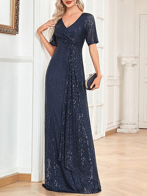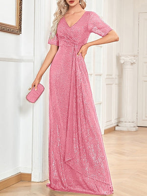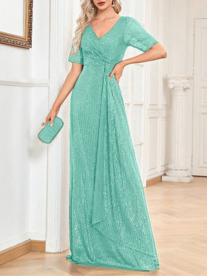 A-Line/Princess V-Neck Short Sleeves Floor-Length Party Cocktail Dress with Sequin