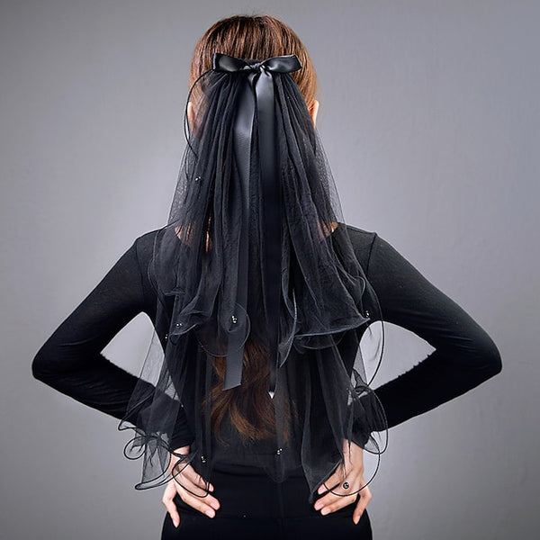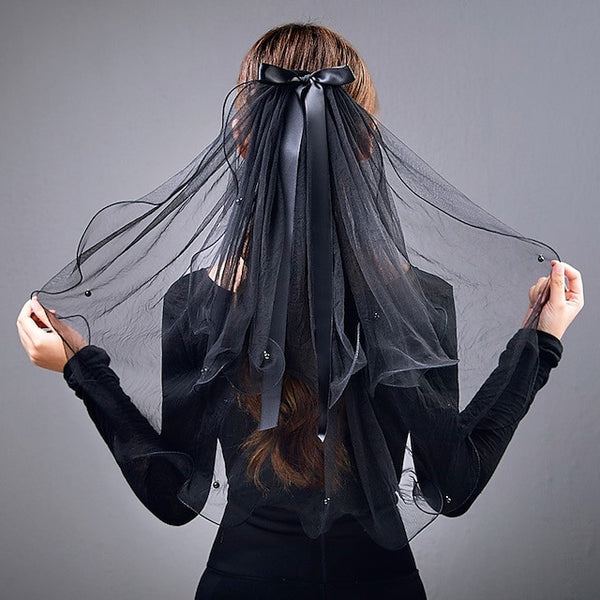 #N941107 Two-tier Personalized / Pearls Wedding Veil with Faux Pearl / Satin Bow Tulle