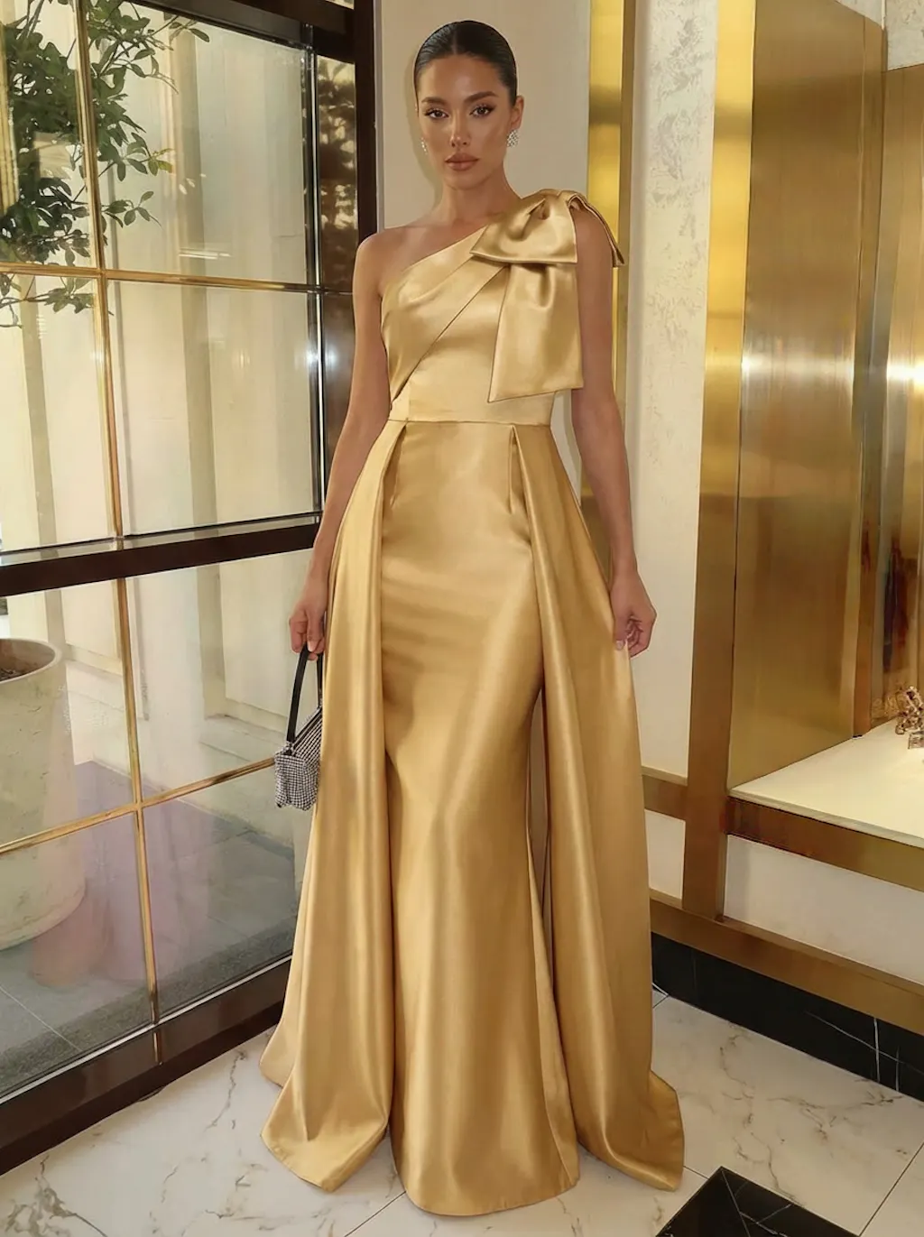 #N250712 A Line/Princesses Prom Dresses Satin One Shoulder Floor-Length Formal Dress With Overskirt Bows