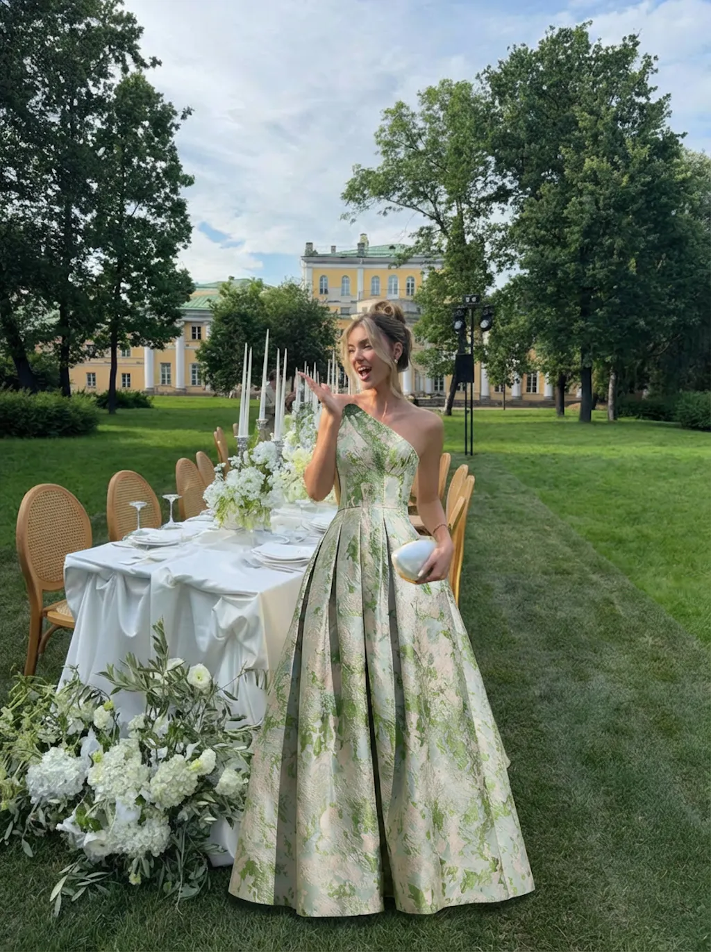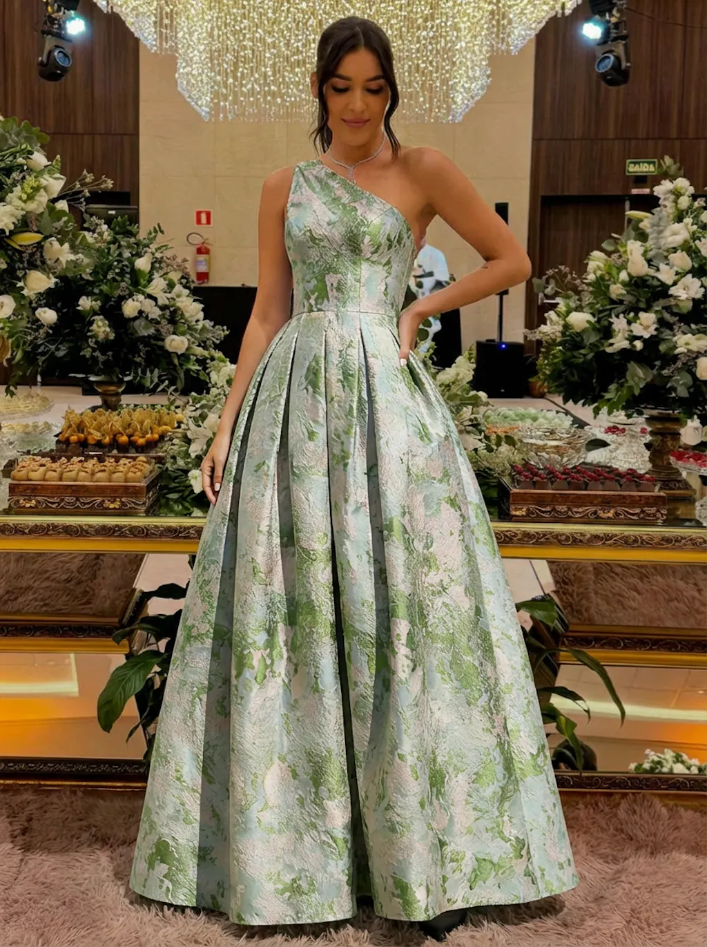 #N461302 A-Line Prom Dress Elegant Floral Jacquard Dress Formal Floor Length Sleeveless One Shoulder with Slit Pocket Sage Wedding Guest Dress