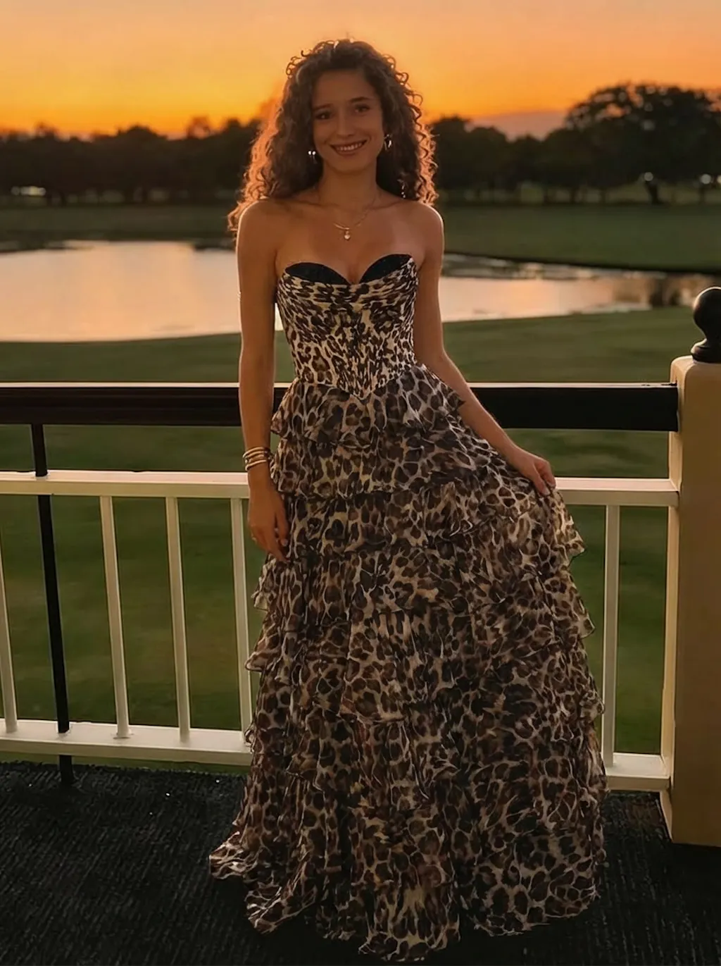 #N356312 A-Line/Princess Leopard Floral Prom Dresses Basque Waist Floor-length Corset Dresses With Layered Ruffles Lace
