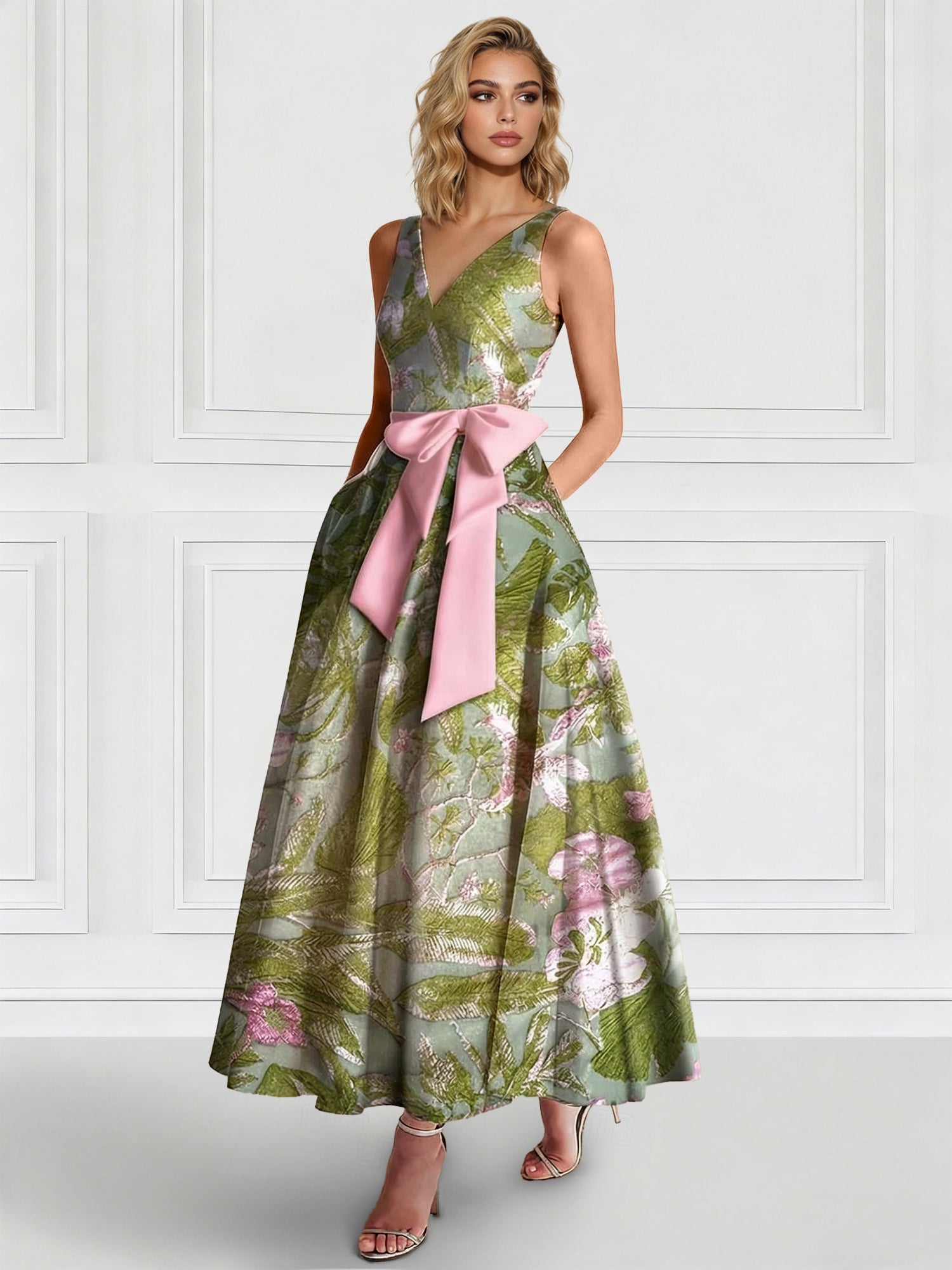 #N354513 A-Line/Princess Cocktail Dresses Floral Formal V Neck Sleeveless Tea Length with Bowknot Pocket