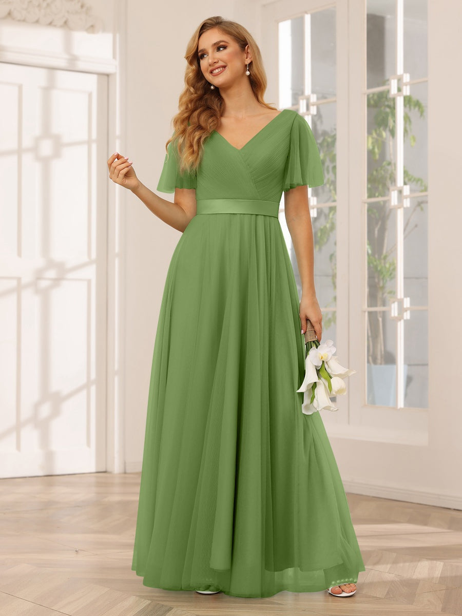 #N5411891 A-Line/Princess V-Neck Short Sleeves Floor-Length Long Bridesmaid Dresses with Lace