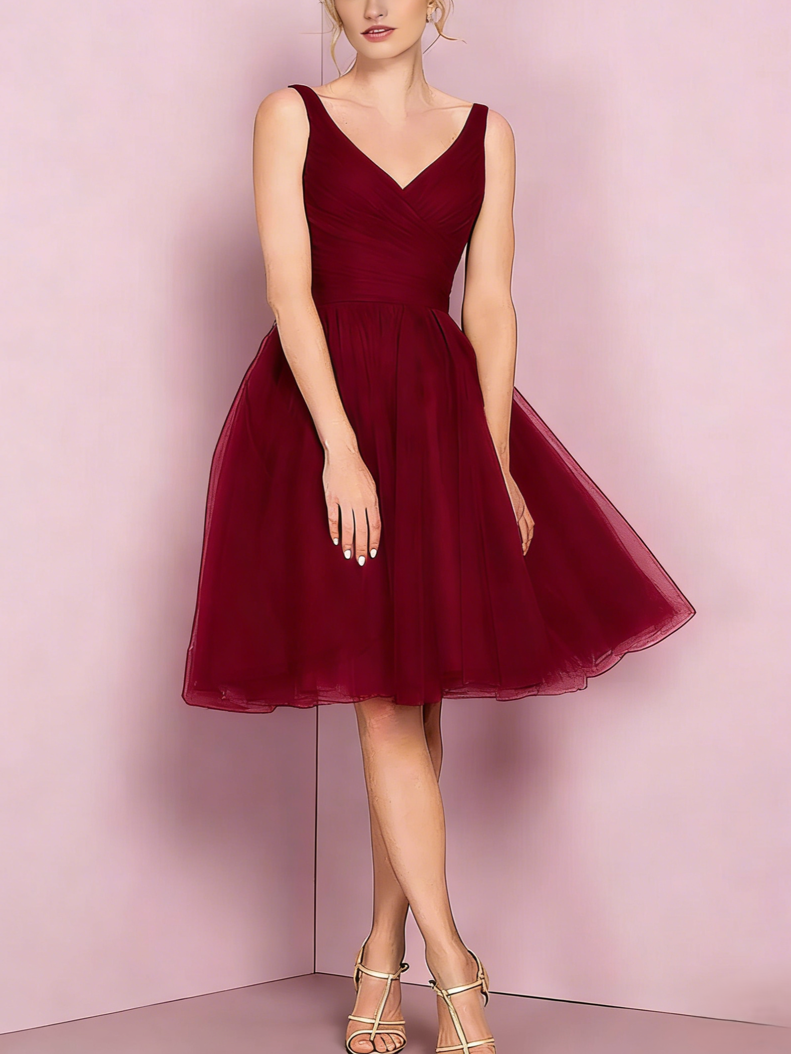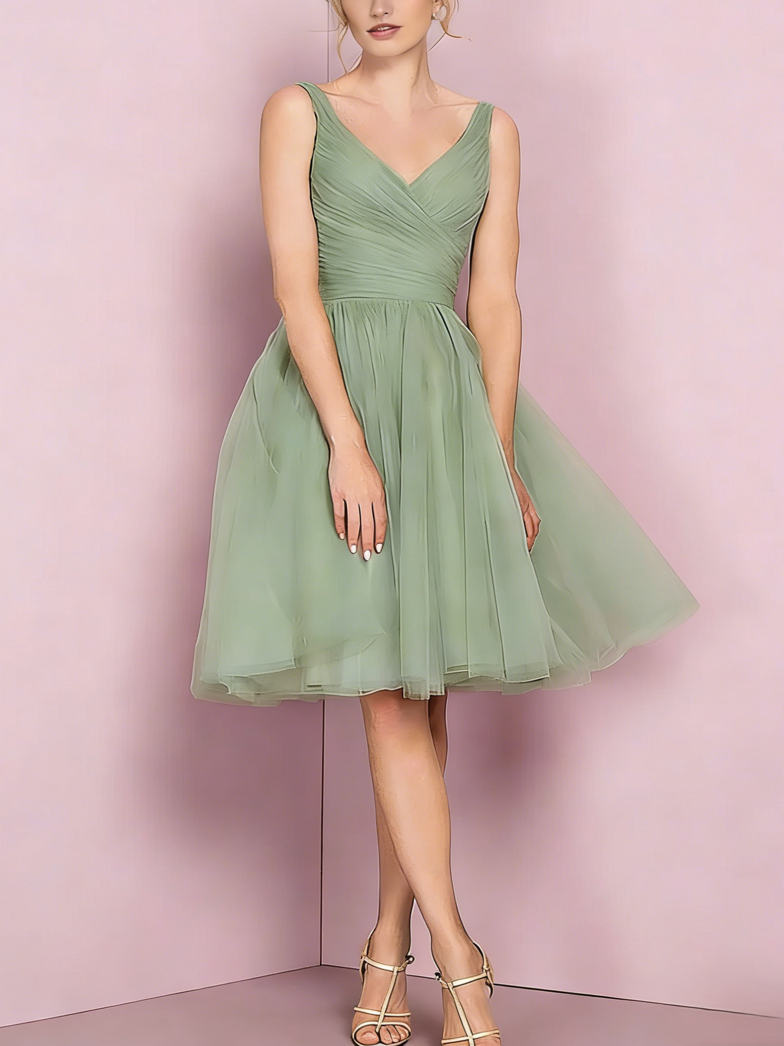 #N341723 A-Line/Princess V Neck Sleeveless Tea-Length Cocktail Dresses with Pleats