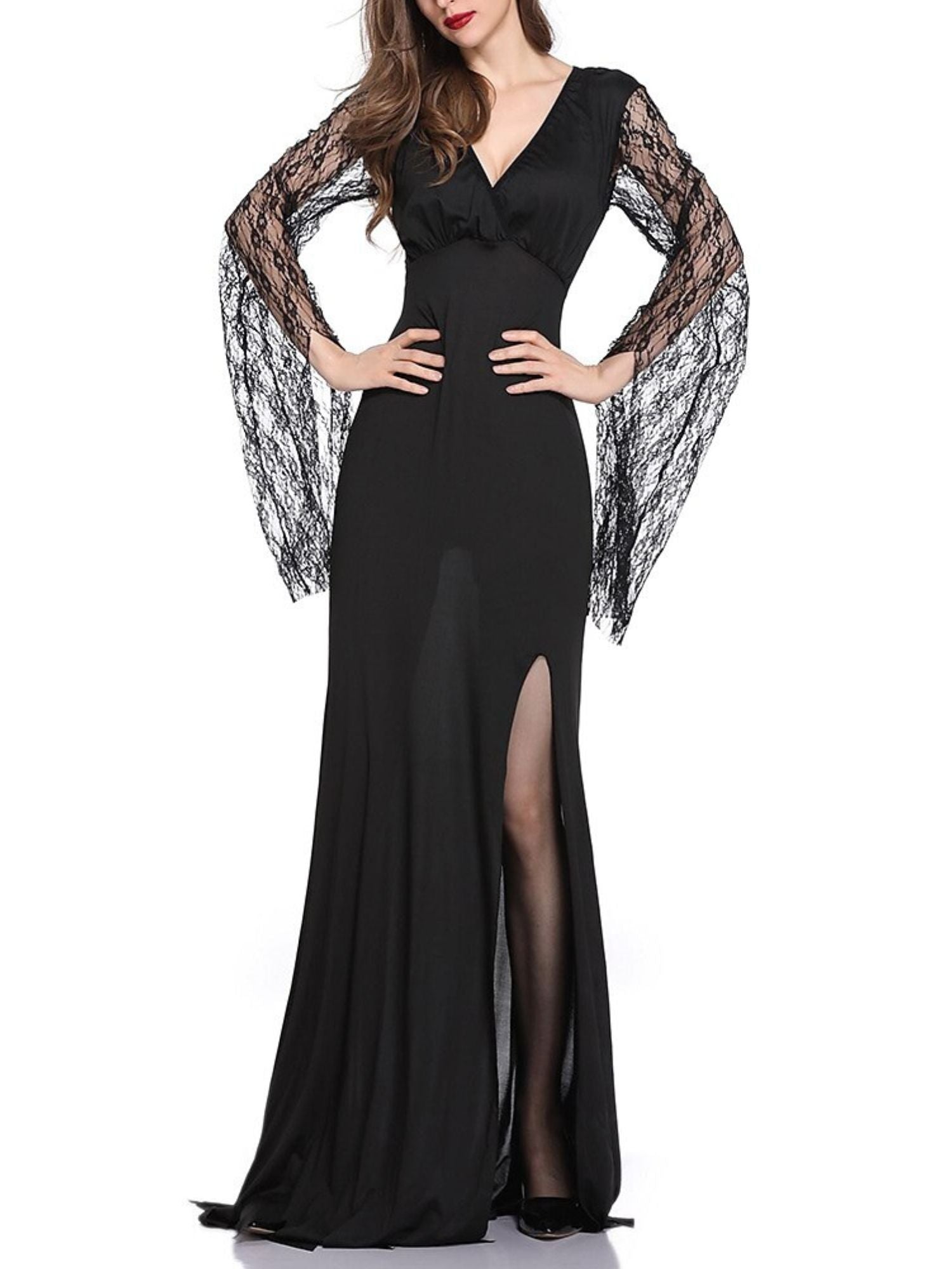 #N6041110W Black Elegant Sheath/Column V-Neck Lace Long Sleeve Floor Length Halloween Performance Costume Dresses
