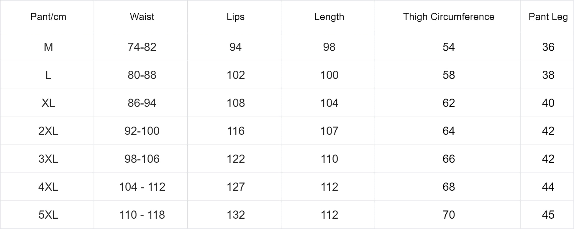 Pant/cm | Waist | Lips | Length | Thigh Circumference | Pant Leg |