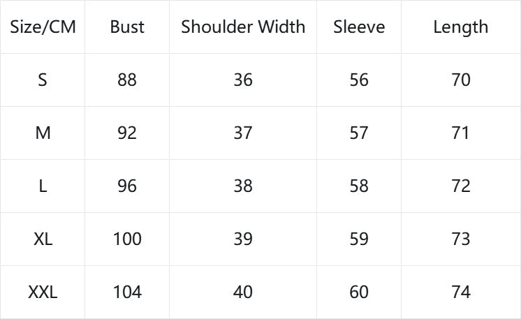 Size/CM | Bust | Shoulder | Sleeve | Length |
